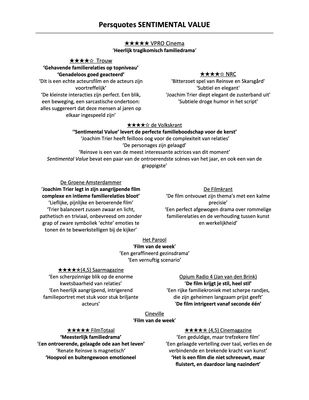 Sentimental Value is de nieuwe film van Joachim Trier, opnieuw met Renate Reinsve in de hoofdrol. De film volgt actrice Nora (Reinsve) en haar zus Agnes, die onlangs hun moeder verloren. Als hun vervreemde vader, de succesvolle filmmaker Gustav, weer contact opneemt met een filmscript, biedt hij Nora de hoofdrol aan. Dit is een eerste stap in de poging om de band tussen vader en dochters opnieuw op te bouwen.